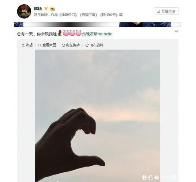 传出绯闻后两人也没有任何遮掩和拖泥带水,陈晓先在微博发布了一张对着天空比一半心的照片,陈妍希也转发给出了回应。 “向天空大声地呼喊说声我爱你”在此刻具象化了,他们就连官宣的方式都如此甜蜜,简直是羡煞旁人。