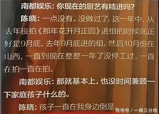 在陈晓拍某部戏接受采访时也透露孩子一直在他身边,拍戏也不会疏忽和孩子的感情。这时候不少人都觉得他真是个好男人,拍戏也会带着老婆孩子。 但网传的“真相”是:只有孩子在他身边,女方并没有陪同。或许是因为工作原因,或许是另有隐情,这些我们隔着屏幕很难知道真相。
