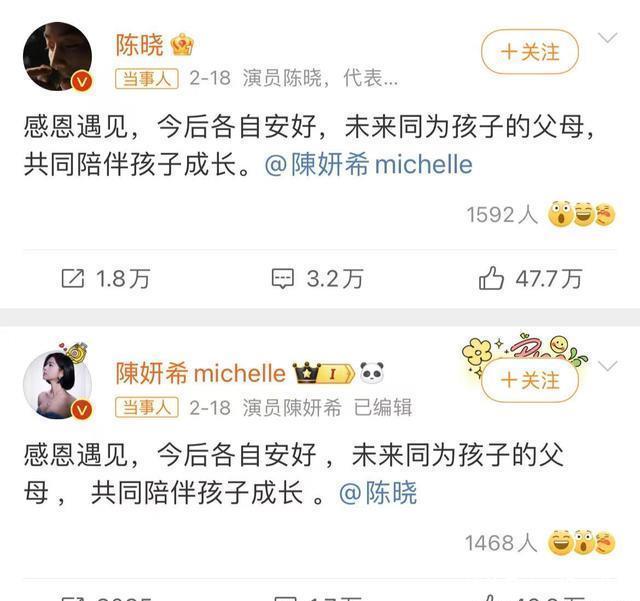 在阅读此文之前,辛苦您点击一下“关注”,既方便您进行讨论和分享,又能给您带来不一样的参与感,感谢您的支持! 文 |奶酪 编辑 |吃瓜小圈 刚过情人节几天,陈晓和陈妍希就以一样的文案官宣了离婚,不过大家似乎对于这件事一点都不意外,甚至可以说是“公开的秘密”。 这么多年他们俩的婚变传闻风波一直不断,因为男方在结婚前后的状态对比实在是太明显了,有很多吃瓜的网友都调侃道“陈晓眼里没光了”。